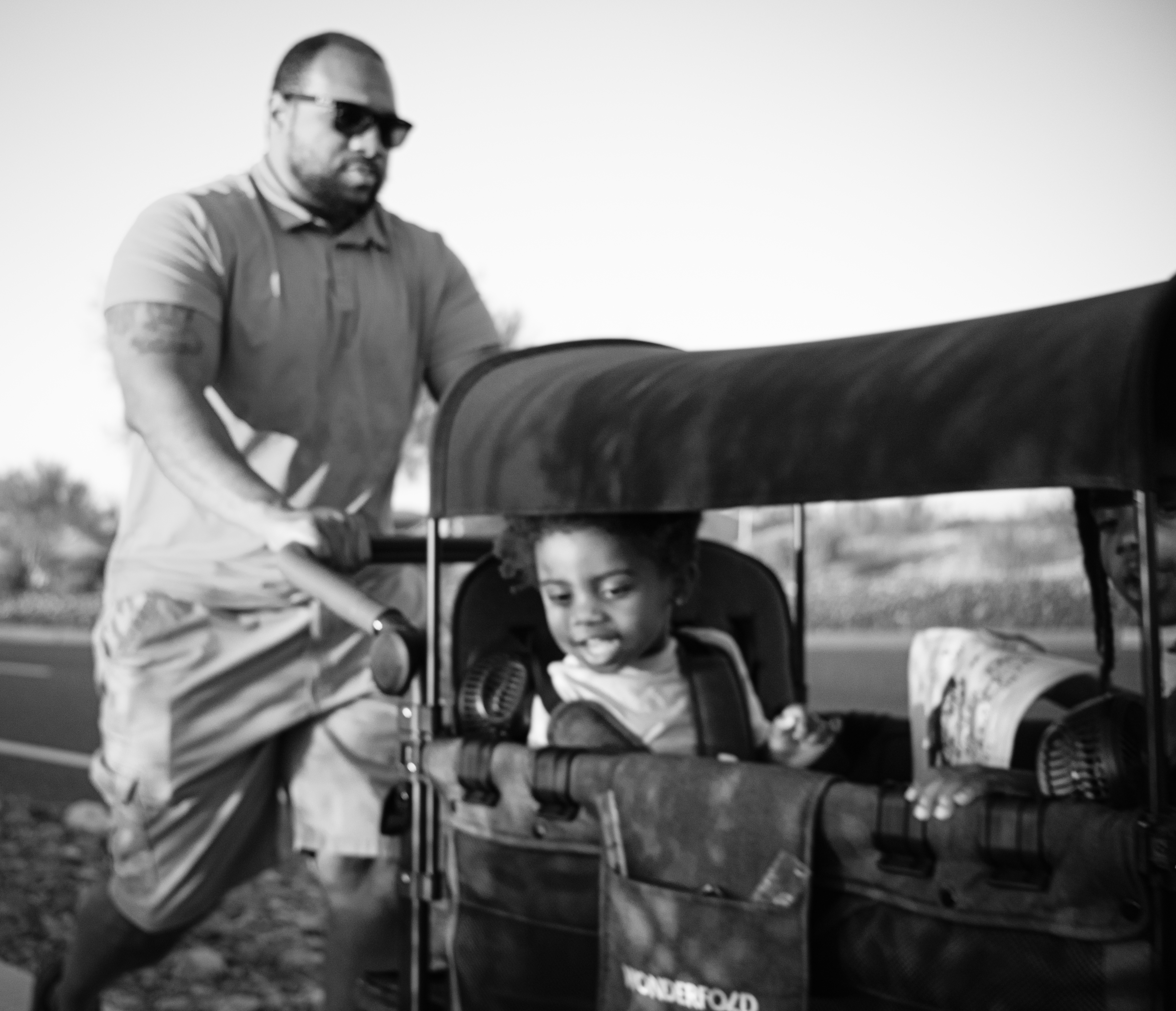 I saw this gentleman pushing his kids in their cart. He looked like he was on a mission (it was a warm Arizona evening, so I am sure he just wanted to be done with the whole thing already), meanwhile the kids were taking in everything around them. I was walking my dog, Ellie, and we approached on a narrow sidewalk. As I readied my camera, I nodded and smiled at the father (who paid little mind to me), and at the same time, the girl in the photo spotted my dog, drawing a smile from her as they went on with their evening. You can also notice another girl on the far right, mouth likely agape at the sight of an usual breed of dog (a Basset Hound).